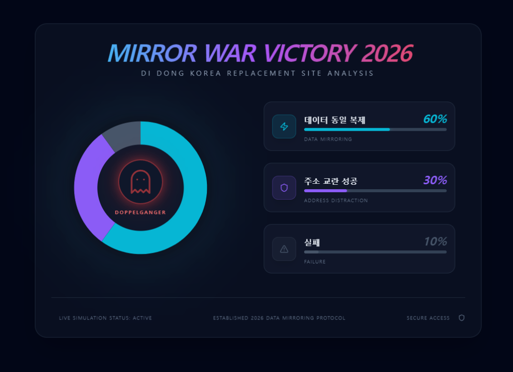 원형 인포그래프 형태로 2026년 di동코리아 대체사이트 미러링 접속 전쟁 승리율을 시각화한 디자인,